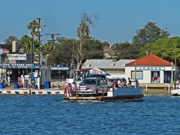 Balboa Island, located in Newport Bay, is actually comprised of three artificial islands. To get there from the Balboa Peninsula, you have to take a three-car ferry (passengers and bikes go on the sides). The island is connected to the north part of the harbor by a bridge (if you want to take your car) but the ferry is the fun option.