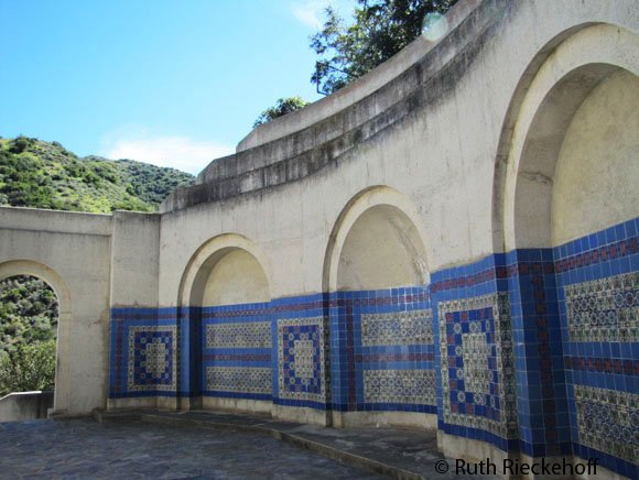 Well, let me tell you the truth. There is not castle in the botanical garden (but I am allowed to dream, right?). The photos are showing the Spanish style memorial structure built to honor William Wrigley Jr. William was a Chicago chewing gum magnate who promoted the development of Catalina Island as a retreat. After his death, the memorial was constructed. It is made out of concrete but crushed island stones were incorporated. The blue flagstone used in the terrace and ramps was quarried from