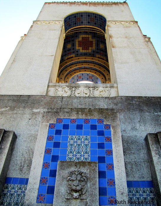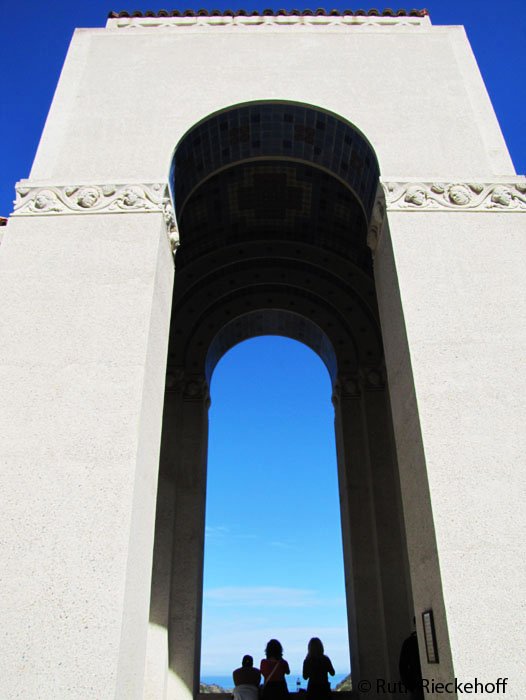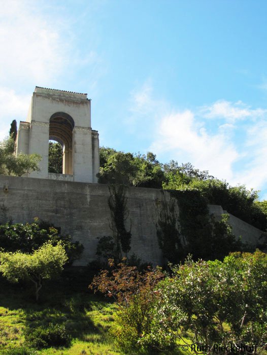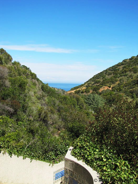 Well, let me tell you the truth. There is not castle in the botanical garden (but I am allowed to dream, right?). The photos are showing the Spanish style memorial structure built to honor William Wrigley Jr. William was a Chicago chewing gum magnate who promoted the development of Catalina Island as a retreat. After his death, the memorial was constructed. It is made out of concrete but crushed island stones were incorporated. The blue flagstone used in the terrace and ramps was quarried from