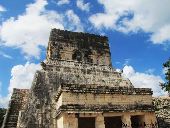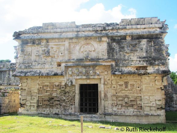 This small building with only one chamber owes its name to its proximity to the so-called “convent” of the Nunnery and to the exuberant decoration on its upper façade, which rises even higher due to its lofty roof comb. There are a lot of hidden messages (hieroglyphs) in this small structure. This was one of my favorite parts of Chichen Itza.