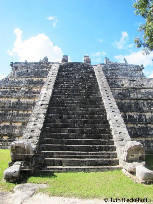 Chichen Itza is one of the most fascinating places I’ve ever been. I didn’t know about clapping in front of the staircase to get the echo. But I did climb the stairs at El Castillo. Going up was OK, but coming down was pretty scary.