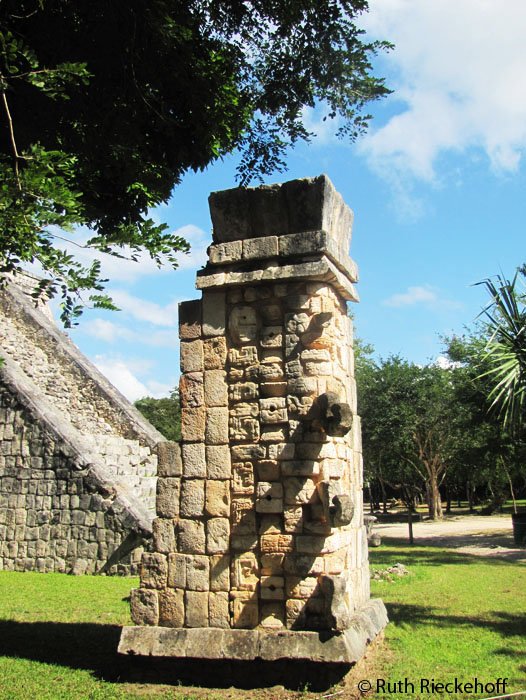 Next to the Ossario, you can find a beautiful carve column. This was a piece that was located at one of the top corners of the Ossario. There used to be 16 of these columns (4 at each side). The carvings represent Chaac (the rain god) and other supreme powers. The carving style is Puuc (Mayans who used to live in a hilly area of the Peninsula). Take a moment to admire this piece of art.