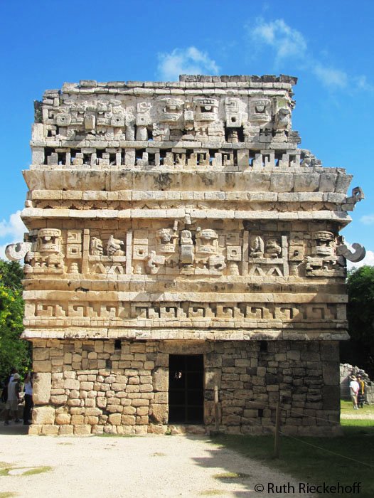 This is one of the best-preserved buildings in the complex. The name comes from the red pigment found inside the structure. Its Maya name is Chichanchob may mean “small holes”. Experts believe the original Maya name comes from the intricate carvings at the top of the building (more Puuc style).