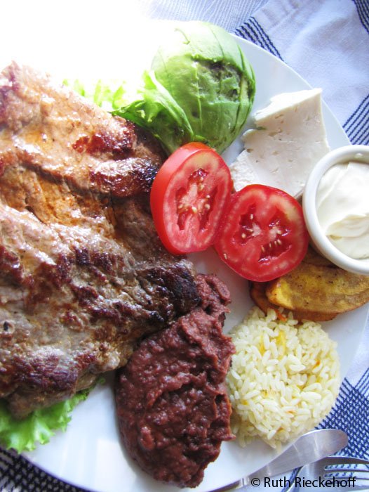 – Typical plate: choice of meat, refried beans, rice, fried plantains, cream, cheese and salad