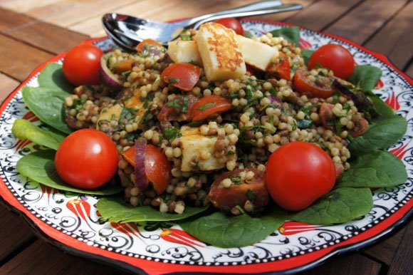 Maftoul and Lentil Salad with Spinach and Grilled Halloumi