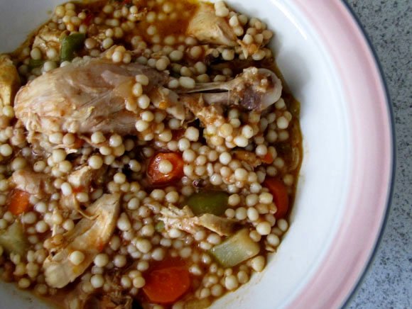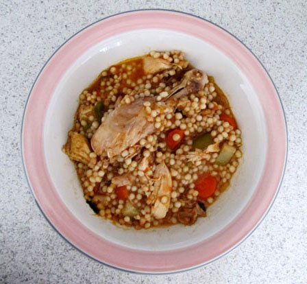 put it in a pan and add chicken soup and let it dry up, the chicken we rub it with salt and pepper and fry it until golden and cripsy. any how maftoul is soooooo goooooood I love it.