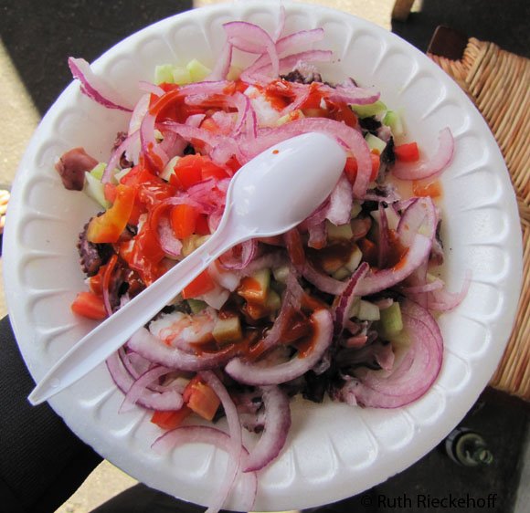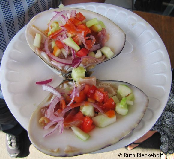 Once at Ensenada, I realized I left home the map of downtown with the big Xs marking the fish taco stands.  That map was of crucial importance in a town where street signs are not common.  The hungry people riding with me started a small revolt and we ended up stopping at our usual seafood joint, Mariscos Navolato.  I wasn’t that crushed since I love this place.  I had a fish tostada covered with shrimp, octopus, red onions, tomato, cucumber, a lot of fresh lemon juice and hot sauce.  Ahh, it was delicious.  My husband had a pata de mula clam cocktail, a fist tostada and a pismo clam topped with fresh veggies.