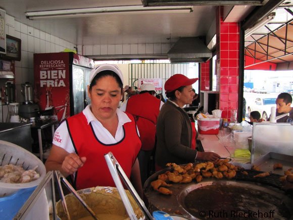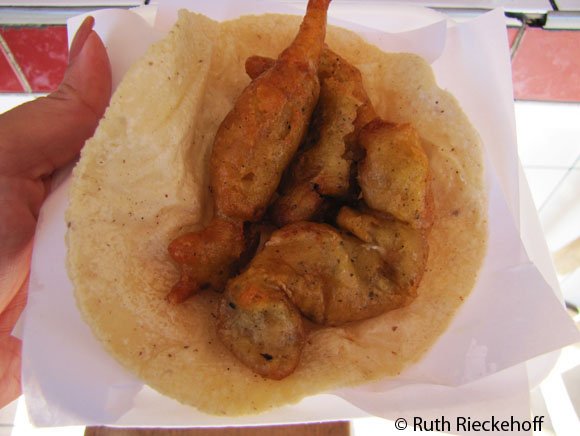 I started to feel great when I saw the ladies making the tortillas, frying the big chunks of fish in a big pot of oil and making sure the garnish bowls were properly filled.  Plus, I saw they had shrimp tacos too. Yum!
