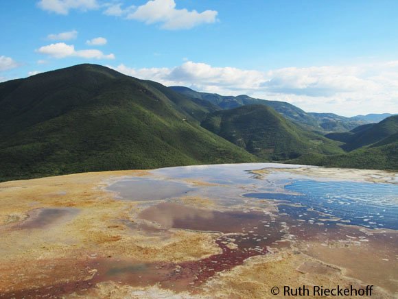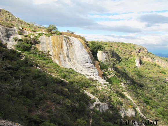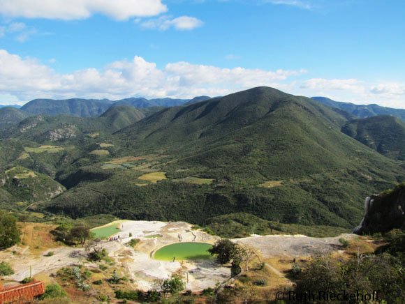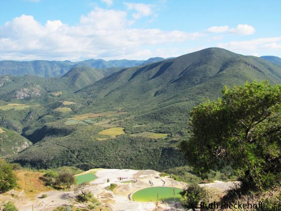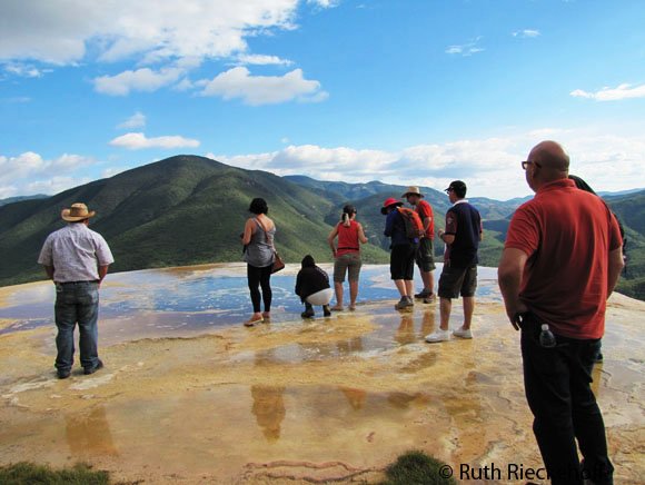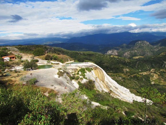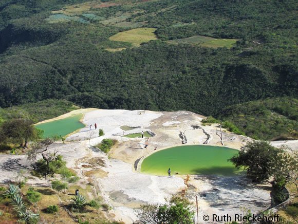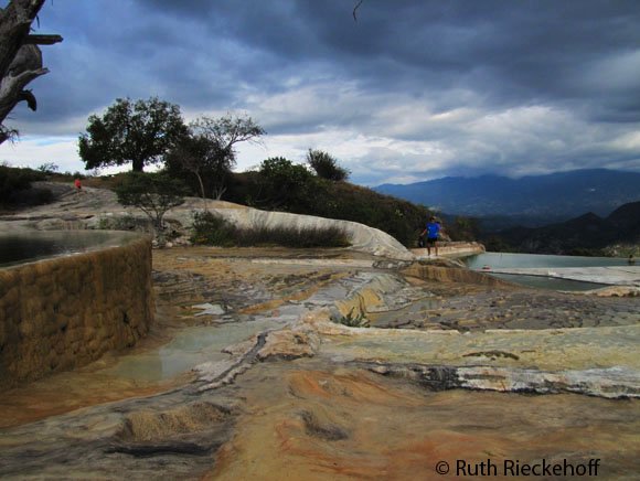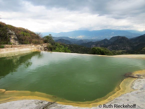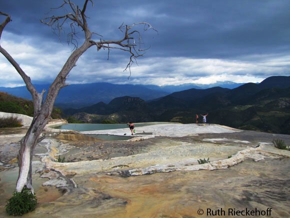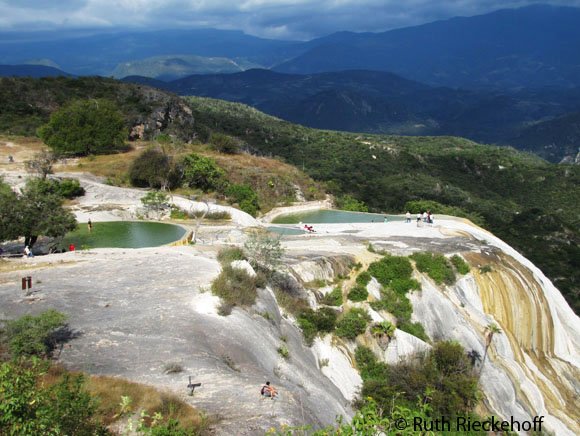 Isn’t that the coolest place? We loved it there! There were lots of people swimming in the pools, but we didn’t swim. We did our trip there as part of an all-day tour that took in the ruins at Mitla, the Teotitlan weavers, the Thule tree and a tequila distillery… what a beautiful and memorable day: http://roadslesstraveled.us/mitla-tour/