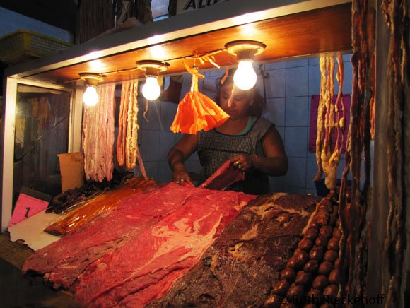 Enter the market and find the meat hall (mercado de las carnes). Almost all vendors offer three things: chorizo, cecina (pork pounded thin, covered in chili sometimes), and tasajo (beef pounded thin). Closely, inspect the meat color when trying to select a vendor. When in doubt, go to where the line is longer. We ordered a kilo of tasajo (13 pieces) and half a kilo of chorizo. The meat vendor is in charge of grilling your meat.