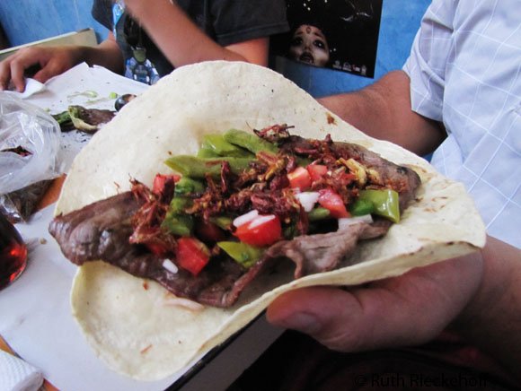 The meat arrives very quickly (check if it is totally cooked, especially the chorizo). Put a napkin over the corner where you are going to eat (there are no plates in here) and start assembling your taco over it. With your hands, break the tasajo into pieces; add chapulines and any of the sides. Repeat as long as you have meat.