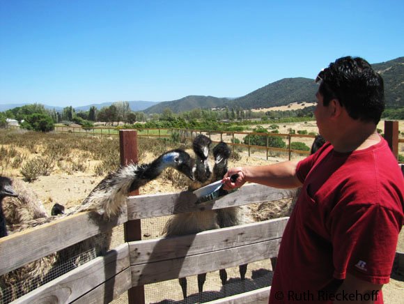 There is an opportunity to fee emus too.  They are smaller than ostriches but not less menacing.  They have creepy orange eyes and blue heads and necks.