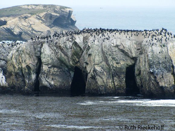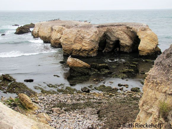 As we continued walking, rock arches, stacks and pillars started to appear close to the shore.  Hundreds of cormorants and oystercatchers were resting over the statuesque piles dotting the coast.  Layers and layers of burnt orange, tan and yellow rock were exposed on the cliffs’ faces.