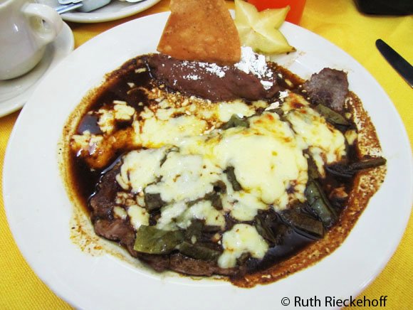 I ordered the Sabanita Transpatio (don’t know how to translate this). It consisted of a cut of meat covered with nopales (cactus) and melted cheese. Everything was drenched in a pasilla chile sauce and served with a side of refried beans.