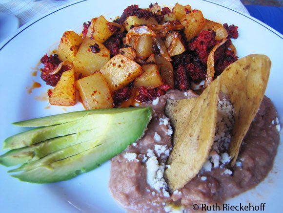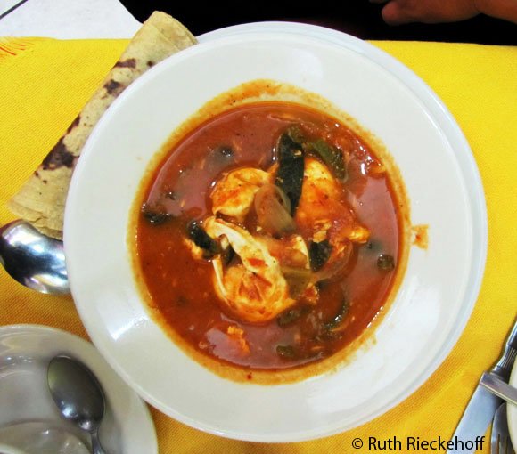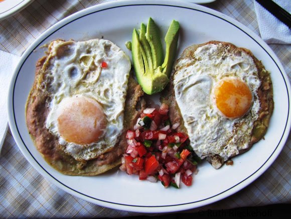 My husband ordered the Huevos Ahogados (Drowned Eggs). The dish consisted of medium-boiled eggs covered in a tomato and rajas (chile strips) sauce.
